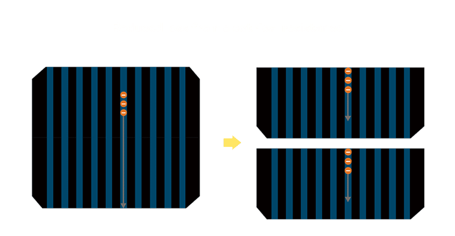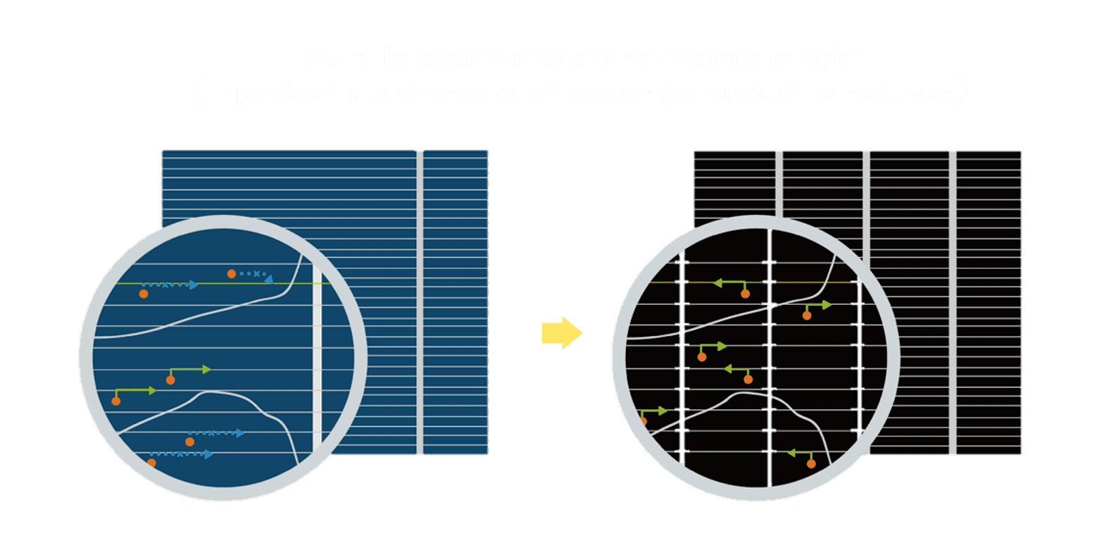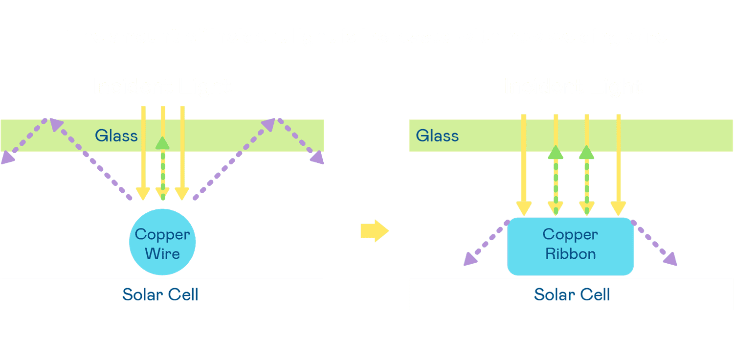 • 电池使用多条铜导线 (Copper wire) 于电池片上形成较短的电流路径,,,,提高电流收集效率,,采用圆形设计的铜导线较传统扁平式的铜焊带 (Ribbon),,,可增加入射至电池的光线量。。。。
